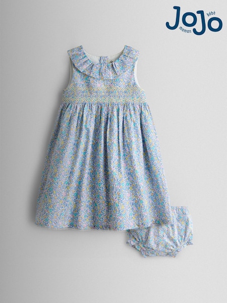 JoJo Maman Bébé Blue Floral Sleeveless Smocked Floral Dress