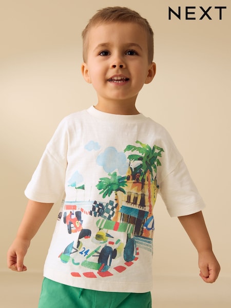 Cream Watercolour Race Car Scene Short Sleeve Back Print T-Shirt (3mths-7yrs)
