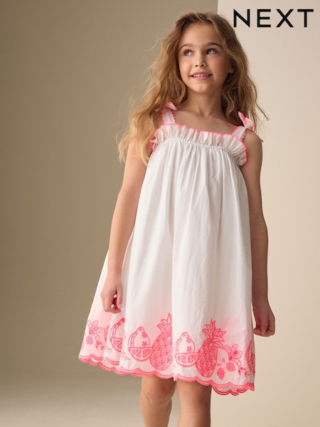 White/Pink Bow Strappy Embroidered Summer Dress (3-16yrs)