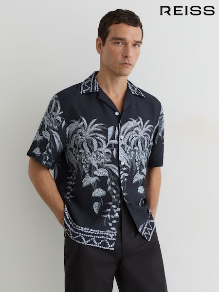 Reiss Navy Camino Palm-Print Cuban-Collar Shirt