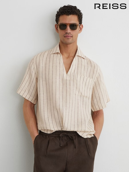 Reiss Oatmeal Brown Quest Linen Pinstripe Open-Collar Shirt