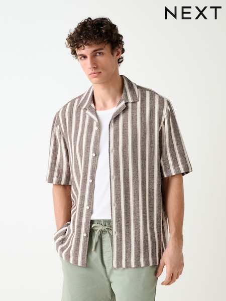 Reiss Brown/Ecru Percy Textured-Stripe Cuban-Collar Shirt Cotton-Blend