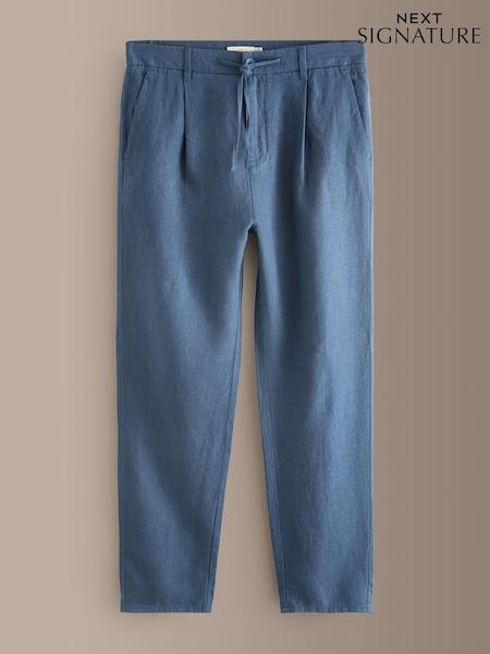 Light Blue Regular Tapered Fit Signature 100% Linen Pleated Chino Trousers