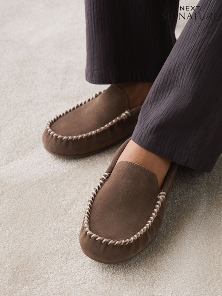 Taupe Signature Moccasin Suede Slippers