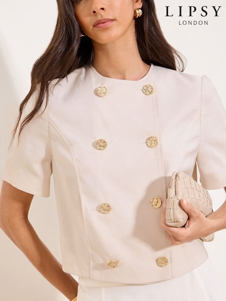 Lipsy Linen-Look Neutral Short Sleeve Double Breasted Shirt