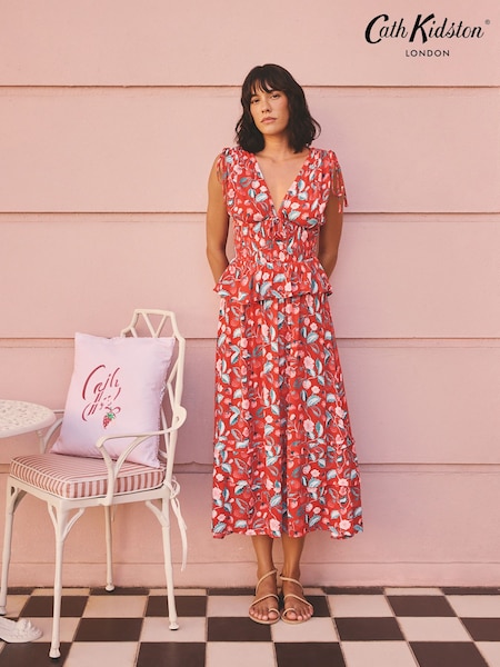 Cath Kidston Red/Pink Floral Tie Waist Long Printed Midi Dress