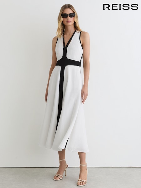 Reiss Ivory/Black Nova Contrast-Trim Cross-Back Midi Dress with Linen