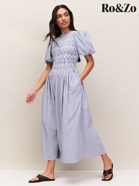 Ro&Zo Blue Petite Cotton Shirred Bodice Dress
