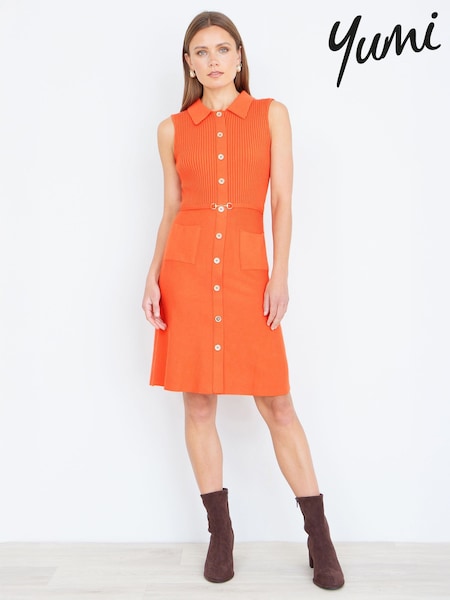 Yumi Orange Rib Knitted Skater Dress With Buckle Detail