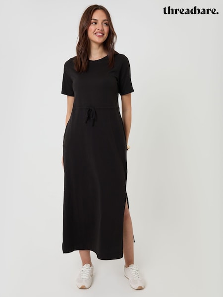 Threadbare Black Drawstring Waist Side Split Cotton Jersey Midi Dress
