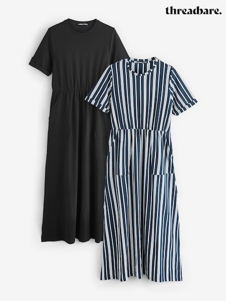 Threadbare Black Crew Neck Jersey Midi Dresses with Patch Pockets 2 Pack