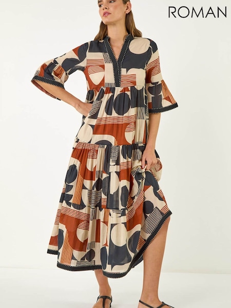 Roman Brown Petite Abstract Print V-Neck Midi Dress