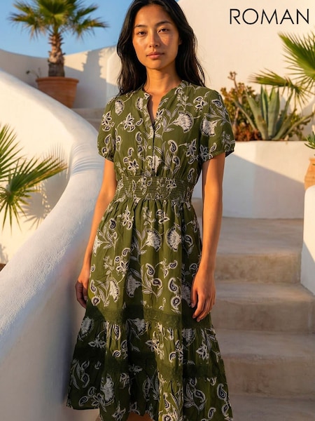 Roman Green Petite Leaf Print Shirred Midi Dress