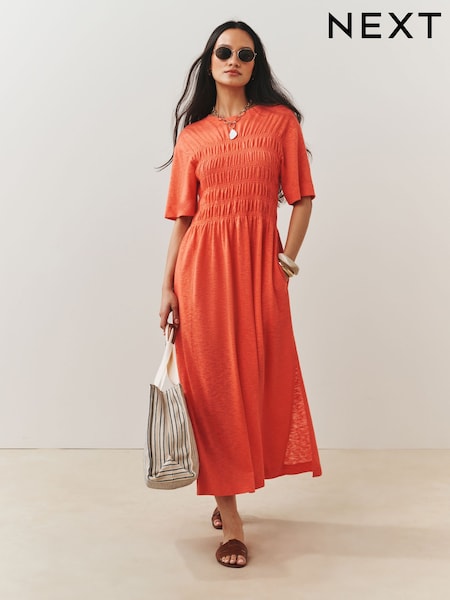 Coral Orange Short Sleeve Shirred Body T-Shirt Midi Dress