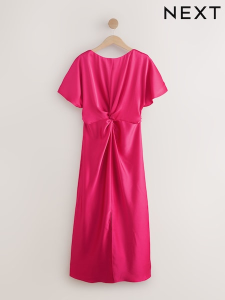 Bright Pink Textured Satin Short Sleeve Twist Front Midi Dress