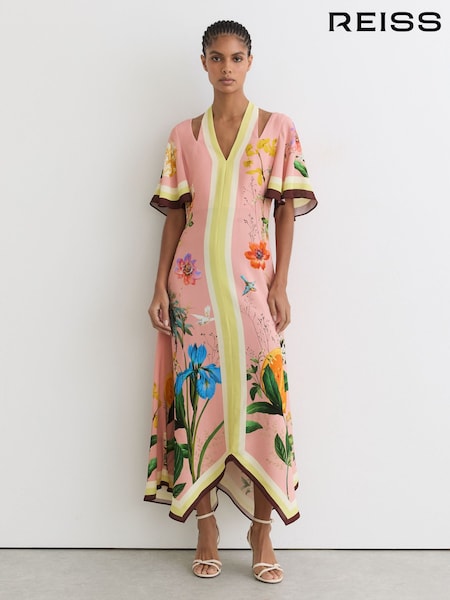 Reiss Pink Poppy Short-Sleeve Waisted Midi Dress