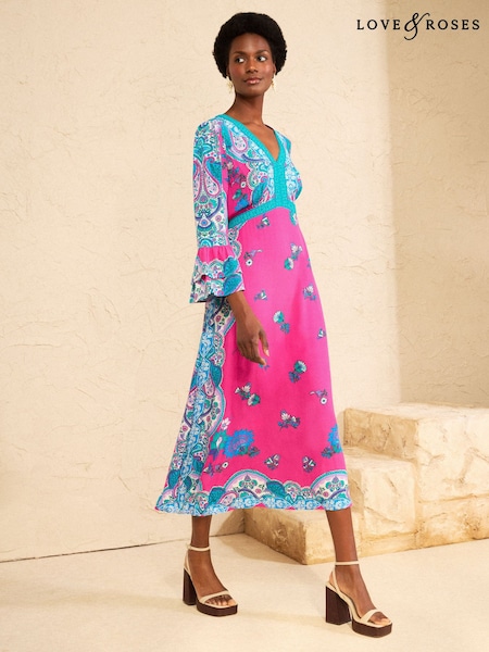 Love & Roses Pink Fluted Sleeve Midi Dress