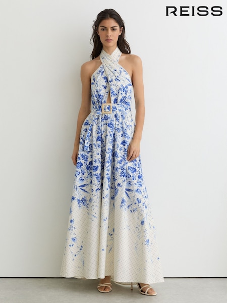 Reiss Ivory/Blue Amaya Petite Cotton Floral-Print Belted Maxi Dress with Stretch