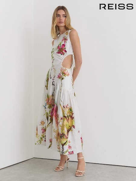 Reiss Ivory Bianca Linen Floral-Print Cut-Out Midi Dress