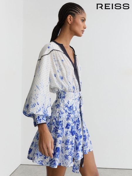 Reiss Ivory/Blue Anisa Floral-Print Belted Mini Dress