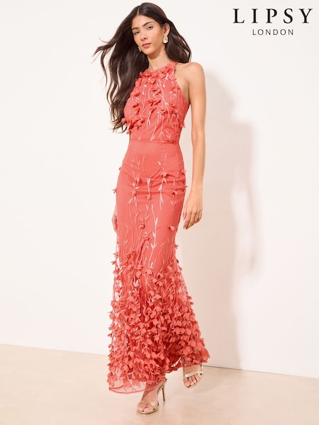 Lipsy Coral Pink 3D Halter Textured Maxi Dress