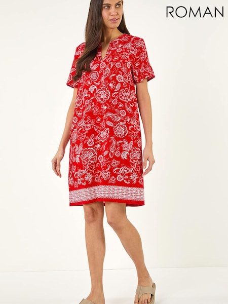 Roman Red Paisley Print Linen Shift Dress