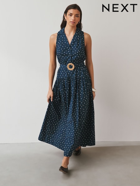 Navy Blue Polka Dot Halter Shirt Midi Belted Dress