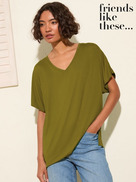 Friends Like These Olive Green Soft Jersey V-Neck Long Sleeve Tunic Top