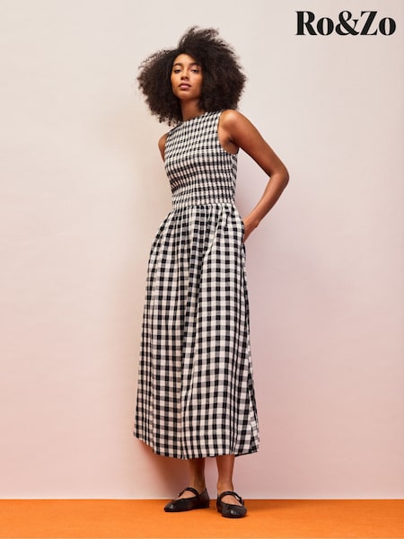 Ro&Zo Black Petite Gingham Shirred Racer Dress With Linen