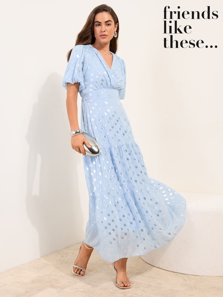 Friends Like These Pale Blue Polka Dot Metallic Short Sleeve Midi Dress