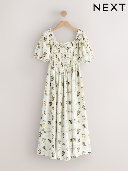 Yellow Floral Print Puff Sleeve Shirred Midi Dress