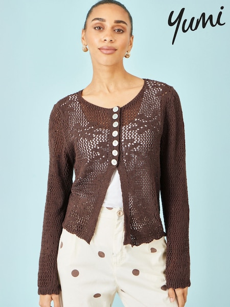 Yumi Brown Flower Crochet Button Up Cardigan