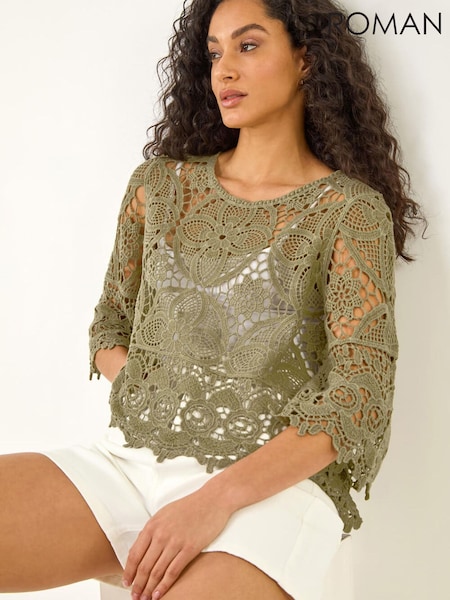 Roman Green Floral Crochet Top