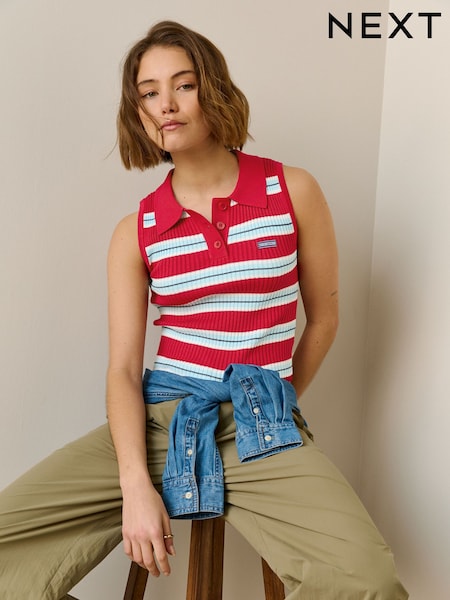 Red/Navy Blue Stripe Sleeveless Knitted Polo Top