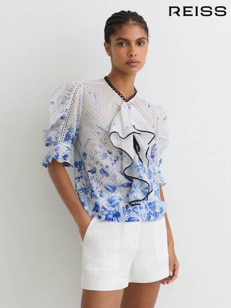 Reiss Ivory/Blue Minni Cotton Floral-Print Ruffle Blouse