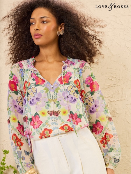 Love & Roses Butterfly Print Notch Neck Tie Long Sleeve Blouse