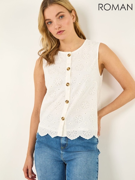 Roman White Broderie Cap Sleeve Stretch Blouse