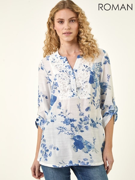 Roman Blue Ditsy Floral Print Stretch Blouse