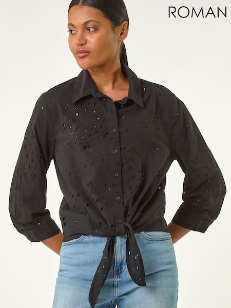 Roman Black Broderie Tie Front Shirt