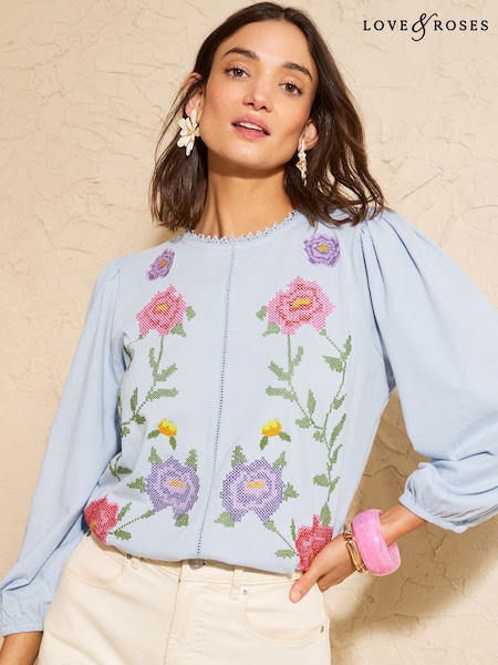 Love & Roses Light Blue Floral Embroidered 3/4 Sleeve Top