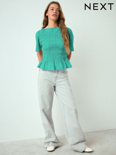 Green Smocked Slash Neck Short Sleeve Top