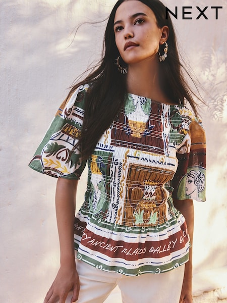 Brown/Green Tile Border Print Smocked Slash Neck Short Sleeve Top