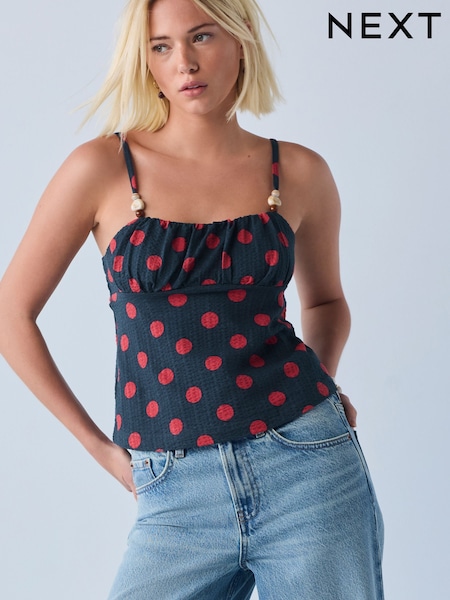 Red/Navy Polka Dot Beaded Strap Sleeveless Top