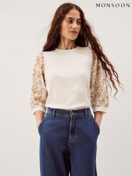 Monsoon Cream Freya Embroidered Sleeve Top