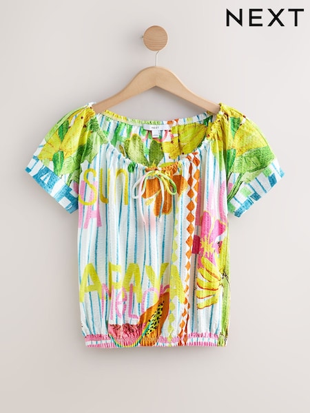 Stripe Tropical Print Short Sleeve Bubblehem Scoop Neck T-Shirt