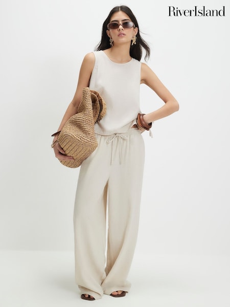 River Island Beige Linen Blend Wide Leg Elasticated Waist Trousers