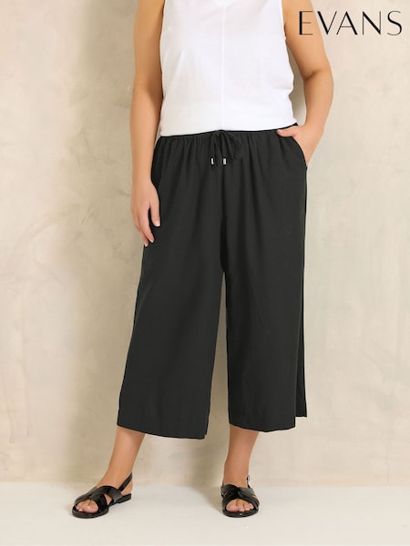 Yours Curve Black Linen Cropped Pull On Wide Leg Trousers