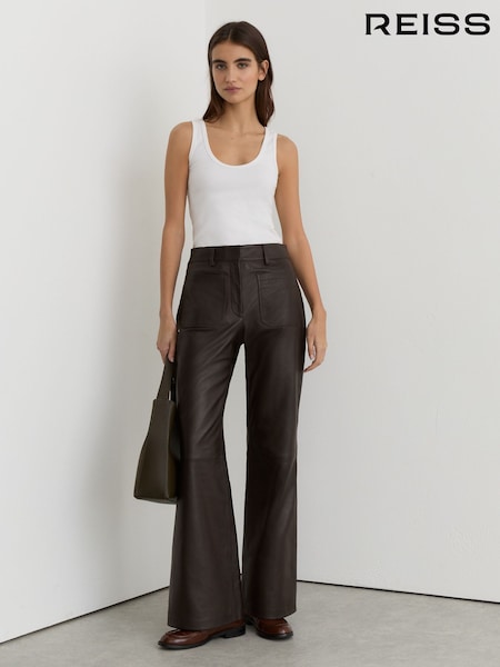 Reiss Chocolate Brown Priya Leather Patch-Pocket Flared Trousers
