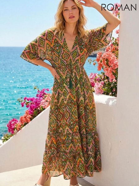 Roman Orange Wrap Bodice Tie Waist Midi Dress