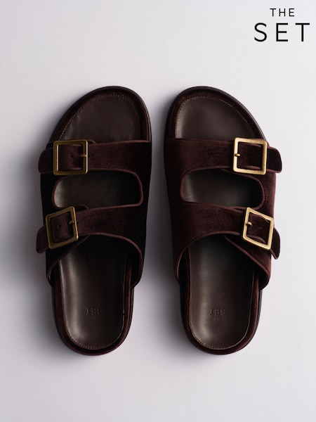 The Set Velvet Double Strap Slip On Footbed Sandals Chocolate Brown